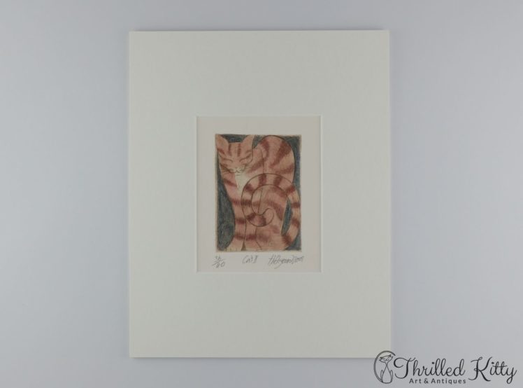 A contented ginger cat is depicted in this characterful little print, created in 2001 as an edition of just 40 copies. He seems to have been caught mid-stretch, his eyes squeezed tight and his long tail curled. The colours of this piece are crisp and the plate mark is strongly defined. It is signed, titled and numbered in pencil by the artist and has been professionally mounted with Fine Art Trade Guild certified materials, including a Larson-Juhl conservation-grade mount and under-mount.