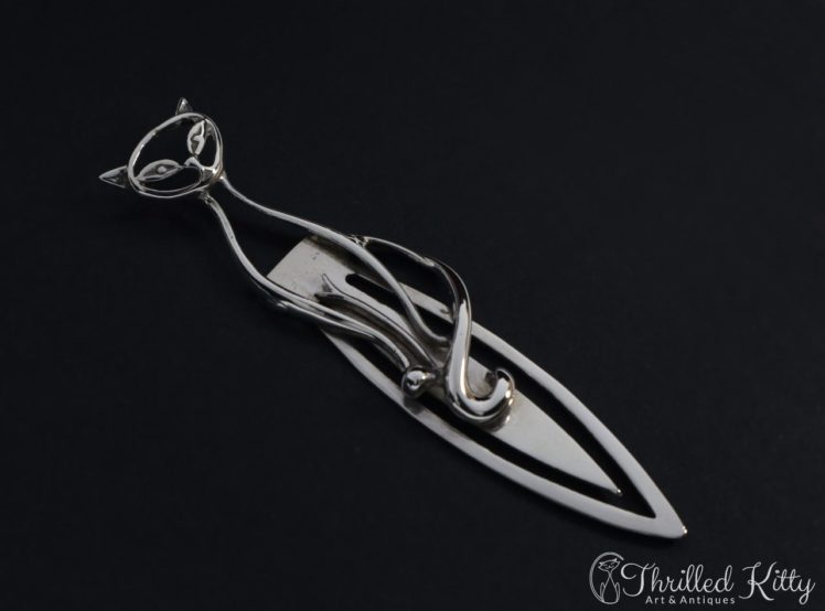A superb silver cat-themed bookmark sculpted in a contemporary openwork style. At almost 9cm tall and weighing in at over 10 grams this is a substantial piece of silver but the light and open design means that it is nicely balanced as well as attractive. The piece carries a full set of hallmarks from the London Assay Office.